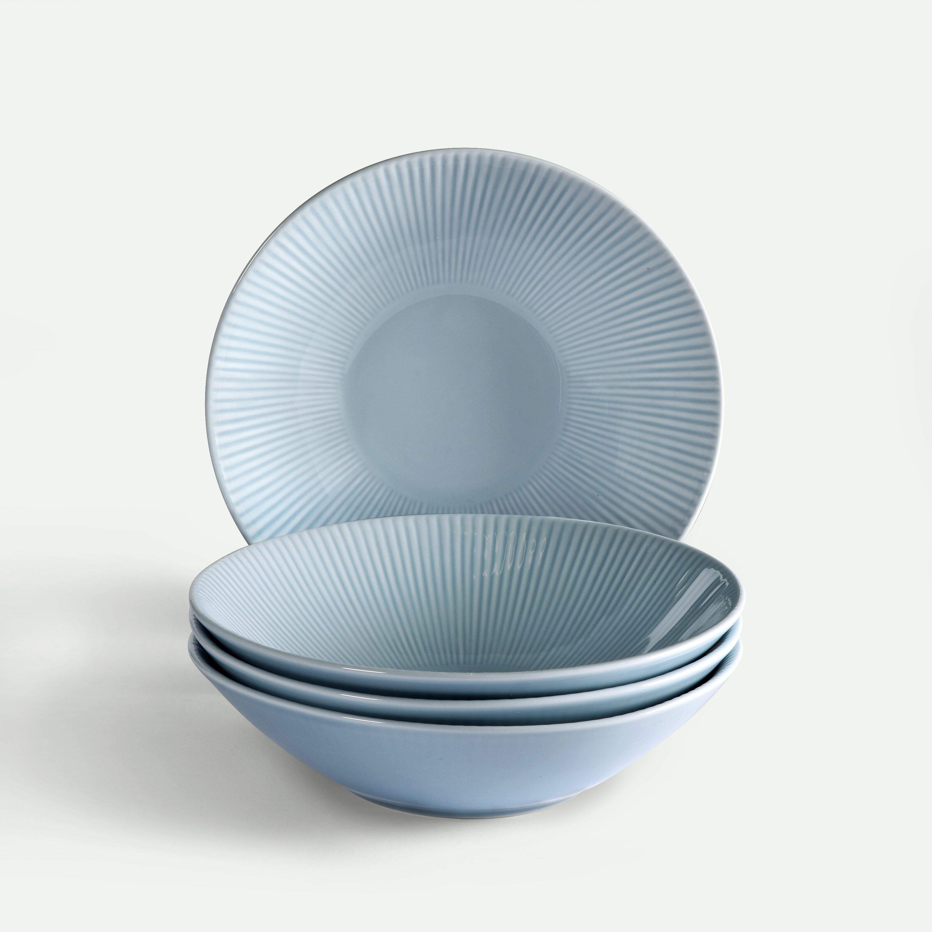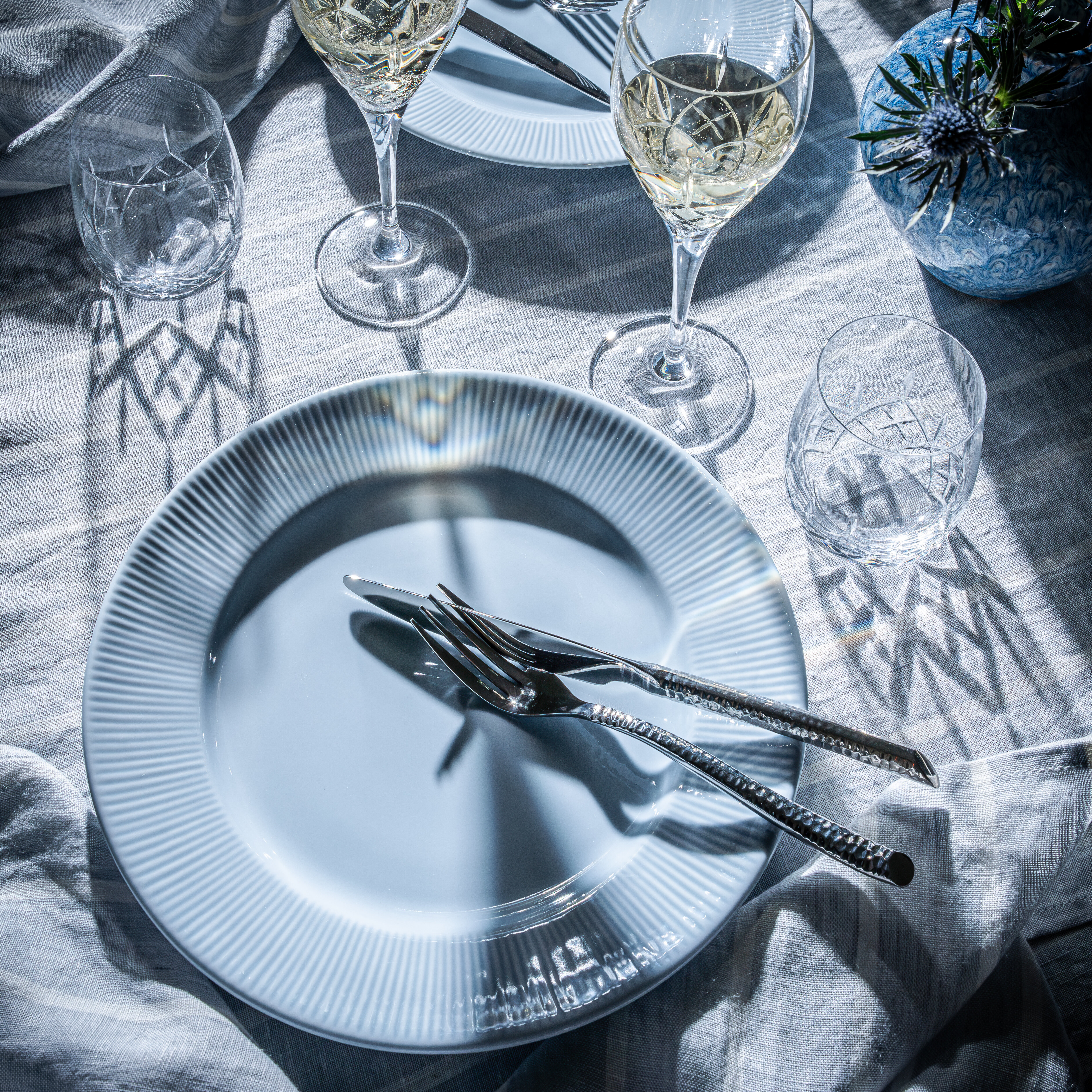 Nordic Dawn-kollektionen er inspireret af den nordiske natur, med mønstre fra solens stråler og farver inspireret af et dugfrisk Dugry. Himmel er en blød blå nuance, der leder tankerne hen på den endeløse horisont. Fås også i farverne Glimt, Bark, Dug og Lyng samt dekorationerne Sommer og Natur. Dæk bordet i samme nuance eller mix og match.