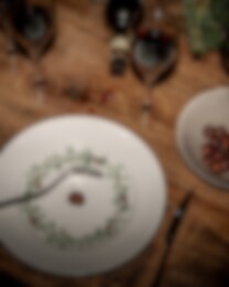 The Nordic Dawn collection is inspired by Nordic nature, featuring patterns from sunbeams and a color palette from a dewy dawn. The Nature decor is adorned with a wreath of larch, mistletoe, spruce, and cones – perfect all year round and for the Christmas table setting. Mix with our other nature-inspired shades in Nordic Dawn for a personal table setting in harmony.